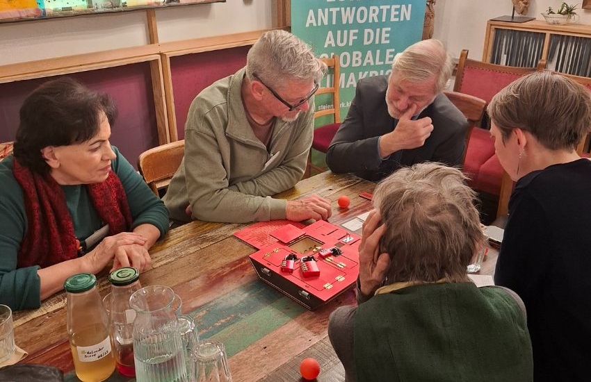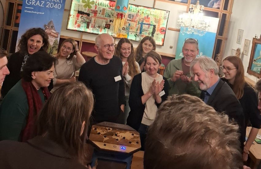 Dem ersten Teil des Abends folgte ein von spielerischer Ansatz angeleitetet vom Klimabündnis Steiermark: Die Klima-Escape-Box ließ die Teilnehmer:innen selbst aktiv werden. Gemeinsam lösten die Teilnehmer:innen Rätsel und fanden Lösungen für die Klimakrise. Der Gewinn: Ein – symbolisches – Ticket für die UN-Klimakonferenz in Belém in Brasilien.