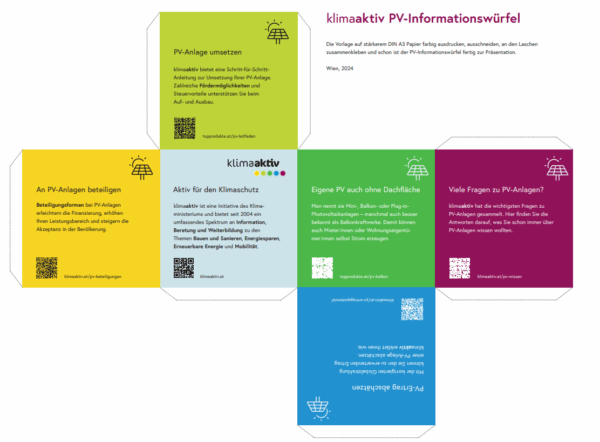 Wir haben den Photovoltaik-Würfel als Kommunikationsinstrument für Vertreter:innen von Gemeinden, Unternehmen und Praktiker:innen entwickelt. Drucken Sie dazu unsere Vorlage in Farbe auf einen Karton, schneiden Sie diesen aus und kleben ihn an den Laschen zusammen – fertig ist Ihr Photovoltaik-Würfel.