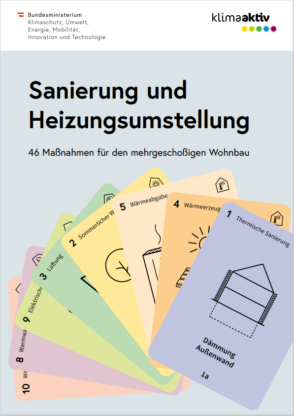 In der Broschüre und den dazu gehörenden Moderationskarten wird die große Bandbreite der möglichen Maßnahmen einer Sanierung und Heizungsumstellung von Mehrfamilienhäusern systematisch aufbereitet und abgebildet. Damit unterstützen wir die Begleitung und Moderation von Gesprächen, in denen Betroffene die möglichen Maßnahmen der Sanierung und Heizungsumstellung erörtern und eine Vorgehensweise beschließen. Bauträger, Planungsbüro, Hausverwaltung u.ä. haben die Möglichkeit, Moderationskarten zu bestellen via klimaaktiv@oegut.at